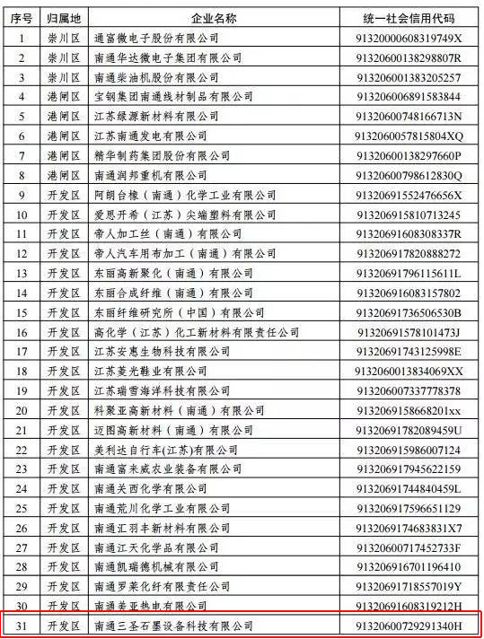 6月2日上午,南通市環(huán)保局公布了關于2016年度南通市區(qū)非國控企業(yè)環(huán)境信用等級評定結果的通知,經對南通市區(qū)406 家非國控企業(yè)2016 年度環(huán)境信用進行評審,確定南通三圣石墨設備科技股份有限公司等50家單位為綠色企業(yè)。